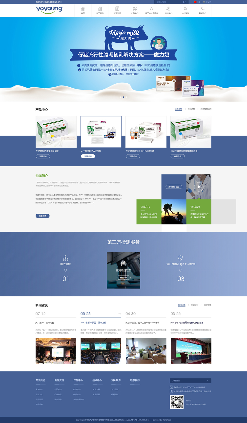 广州悦洋生物技术有限公司(简称“悦洋生物”)创立于2005年,致力于动物疾病体外诊断(IVD)产品的研发、生产、销售及三方检验服务。悦洋生物已发展成高新技术企业、广州市科技创新小巨人企业、中国畜牧兽医学会动物传染病分会常务理事单位,并于2014年在广州股权交易中心成功挂牌,股权简称:悦洋生物,股权代码:890581。2016年底悦洋生物成为全国首批同时也是广东省一通过农业部免疫学类诊断制品(A类)GMP生产线验收的企业。2017年顺利通过ISO9001国际质量管理体系认证。