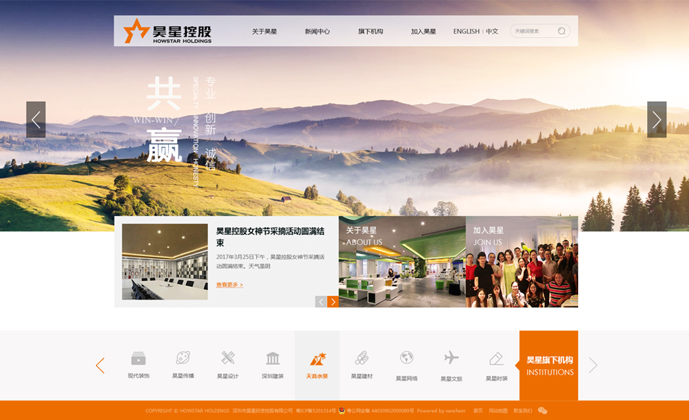 深圳市昊星投资控股有限公司,是专注于创意文化产业投资、策划、设计、施工和运营的全案服务商。目前,旗下拥有现代装饰杂志社、昊星传播、昊星设计、深圳建装、天音水景、昊星建材、昊星网络、昊星文旅、昊星时装等专业公司。作为创意文化产业全案服务商,昊星控股以客户需求为导向,提供投资、策划、设计、施工和运营五位一体的服务,以战略伙伴为行动思想与产业链上下游众多客户建立了长期合作关系。昊星控股将不断开拓创新、与时俱进,为推动中国创意文化产业发展作出努力。