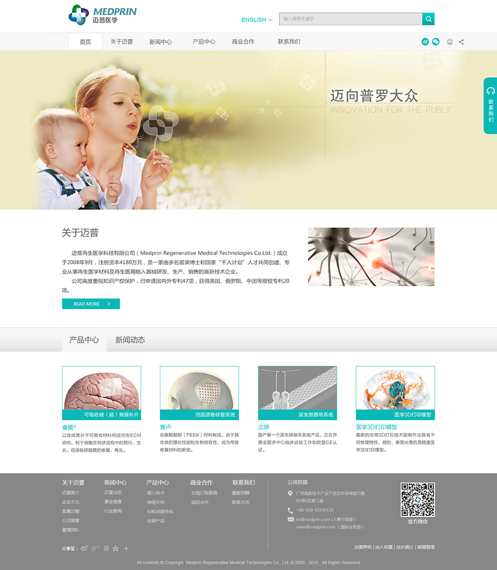 迈普再生医学科技有限公司(Medprin Regenerative Medical Technologies Co.Ltd.)成立于2008年9月,注册资本4321万元,是一由多名留美博士和“千人计划”人才共同创建、专业从事再生医学材料及再生医用植入器械研发、生产、销售的高新技术企业。
