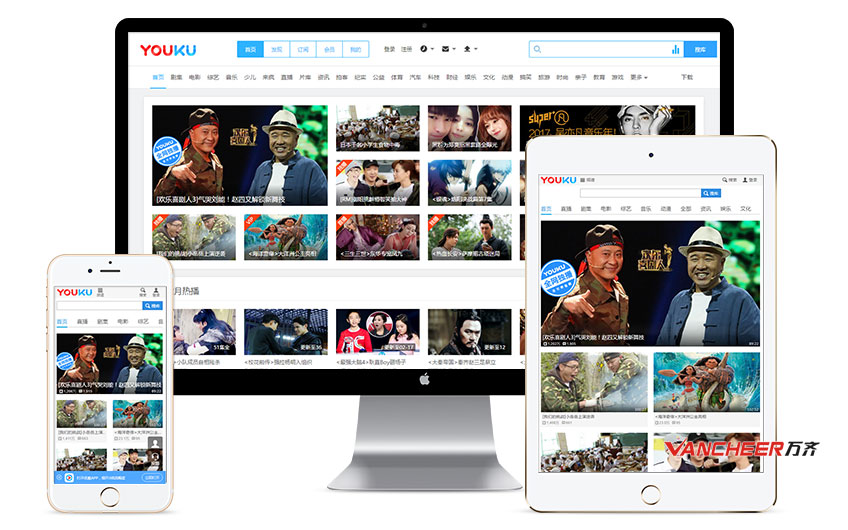优酷 ,这是一个很好的例子(PC电脑、平板、手机的响应式显示效果):